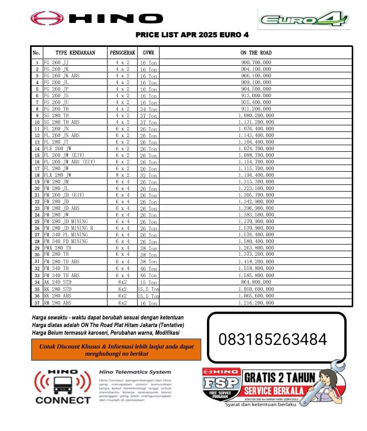 Berikut adalah Daftar Harga pembelian unit mobil Hino Jakarta. Untuk info lebih lengkap dan lebih jelas dapat langsung menghubungi saya melalui tombol WhatsApp yang telah disediakan 😁